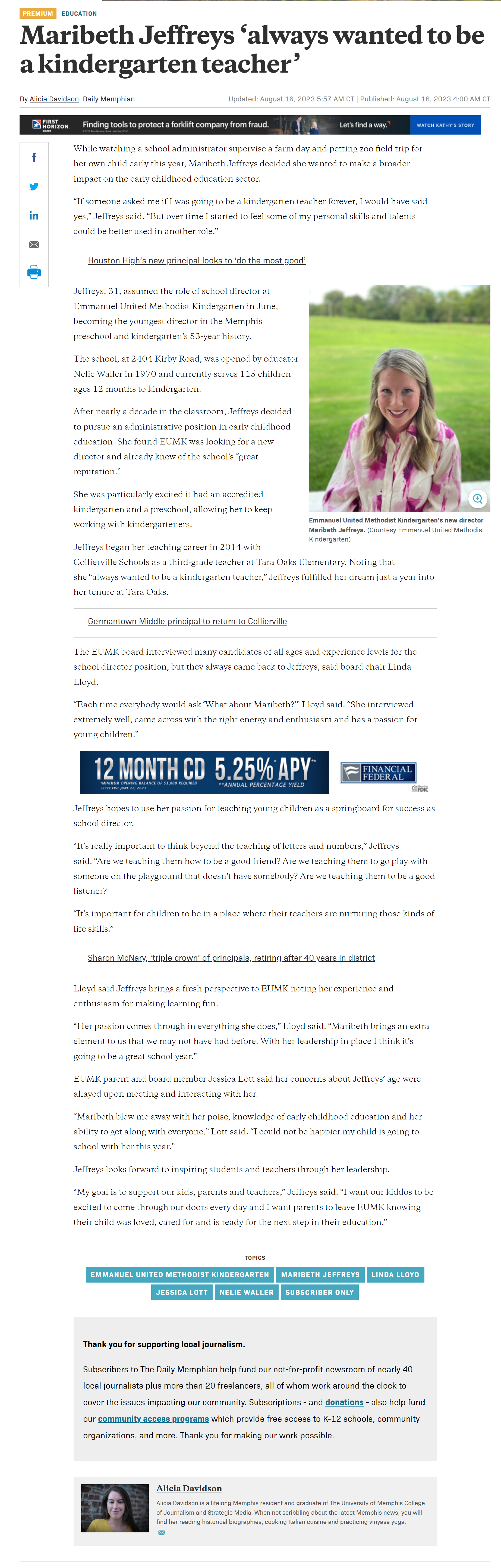 Emmanuel United Methodist Kindergarten welcomes Maribeth Jeffreys as the school's new School Director, marking her 10th year in the field of education. Holding a Bachelor of Science degree in Elementary Education with a concentration in Early Childhood Education from Mississippi State University, Maribeth brings a wealth of knowledge and experience to her new role.