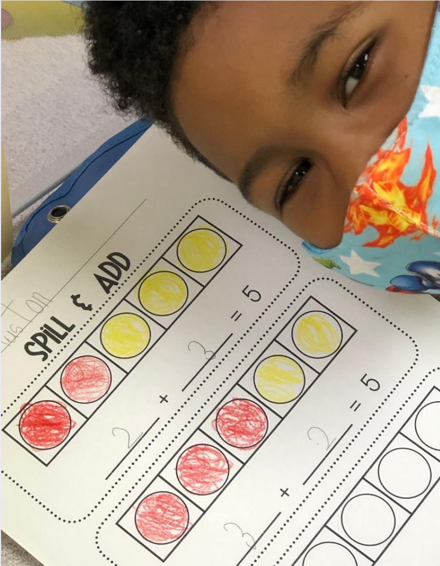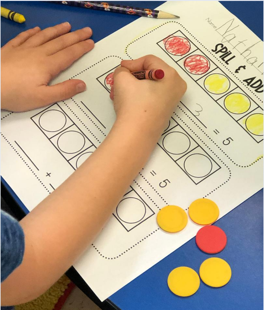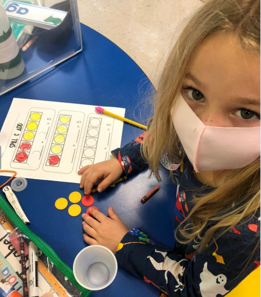 What a treat to visit Mrs. Hogue’s and Mrs. Wyatt’s SK class, as they rolled the red and yellow counters to create and then write addition equations to the sum of 5!